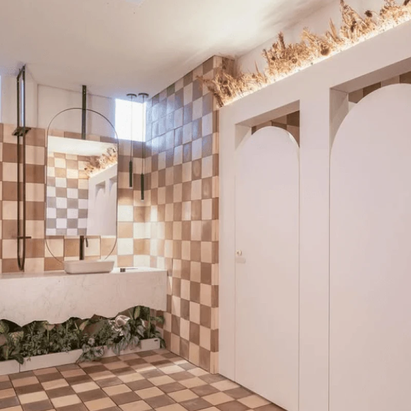 Puxadores de Porta Miró no toilet do espaço projetado pelo escritório MAR Arquitetura, o Café Cremme.